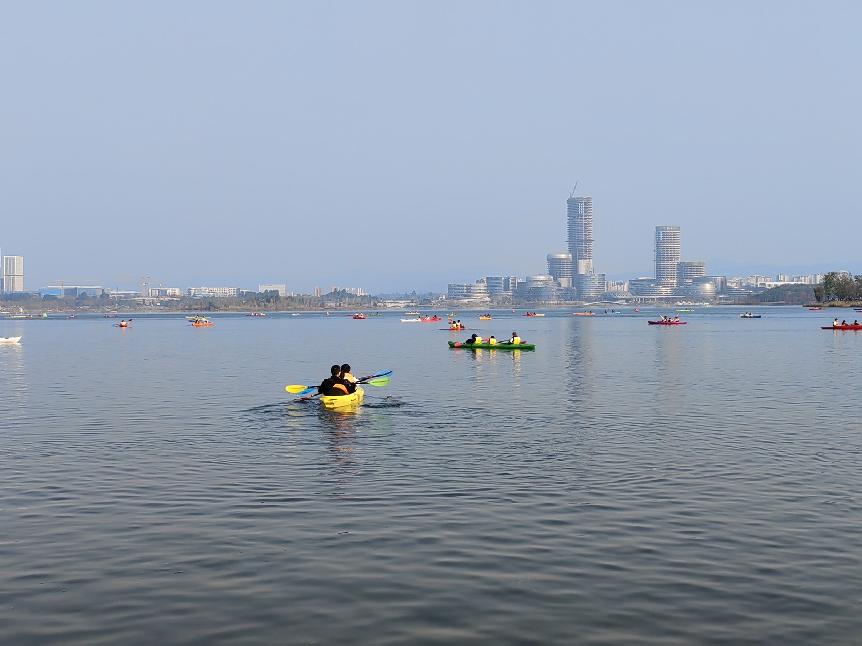 旅客在成齐喜跃湖划皮划艇。新华社记者 董小红 摄